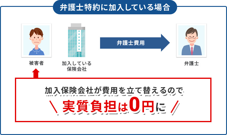 現在ご加入の自動車保険に「弁護士費用特約」を付帯してれば、弁護士費用は保険会社が負担してくれます(上限300万円まで)。ご自身だけでなくご家族が特約に入っている場合でも利用できるケースがあるので、一度ご家族の分も含め確認することをお勧めします。